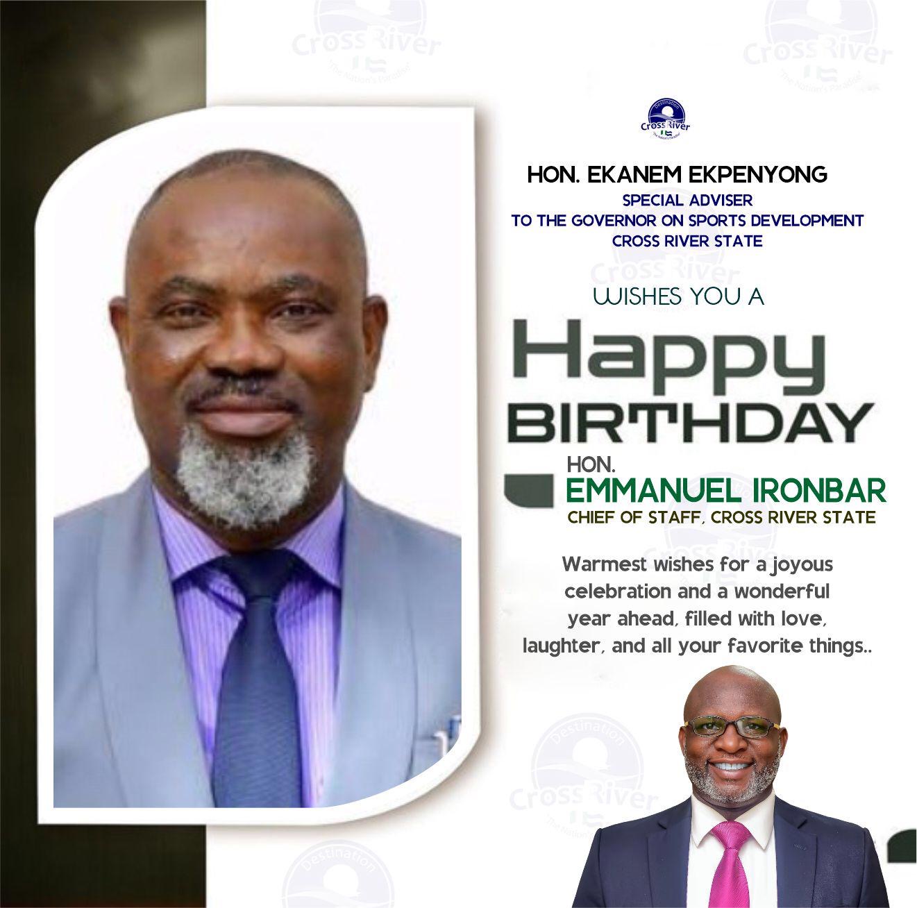 Dear Hon. Emmanuel Ironbar, Chief of Staff to our People First Governor, Sen. (Prince) Bassey Edet Otu, as you mark your new age today, the Cross River State Diaspora Commission led by Hon. Otu Okor, we pray God Almighty to shower more of His blessings upon you.